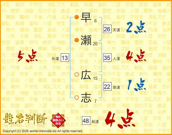 早瀬広志さんの天運は26画の2点!