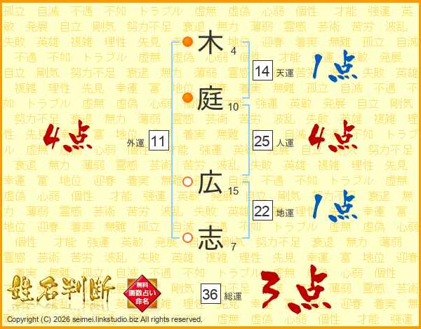 生活面を象徴する運勢です。外部から受ける影響力を表し、結婚運、家庭運や職場、環境への順応性を表します。総運から人運を引いた画数。姓や名が1文字の場合を除く。