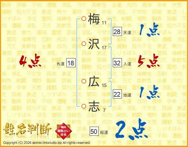 生活面を象徴する運勢です。外部から受ける影響力を表し、結婚運、家庭運や職場、環境への順応性を表します。総運から人運を引いた画数。姓や名が1文字の場合を除く。