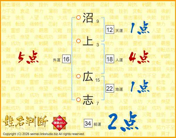あなたの人生を表す1番重要な運勢です。生涯を通じて影響する総合運となり、主に50歳以降の晩年期に影響を及ぼします。苗字と名前の合計画数。
