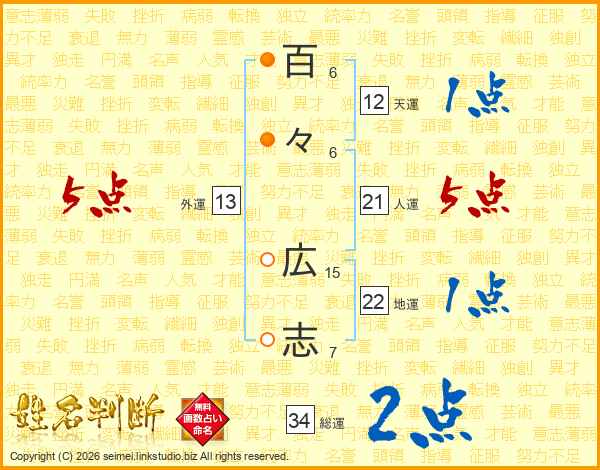 あなたの人生を表す1番重要な運勢です。生涯を通じて影響する総合運となり、主に50歳以降の晩年期に影響を及ぼします。苗字と名前の合計画数。