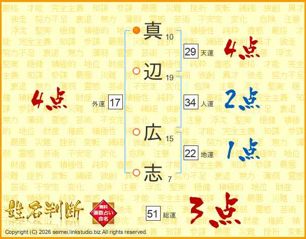 真(10画)辺(19画) 広(15画)志(7画)