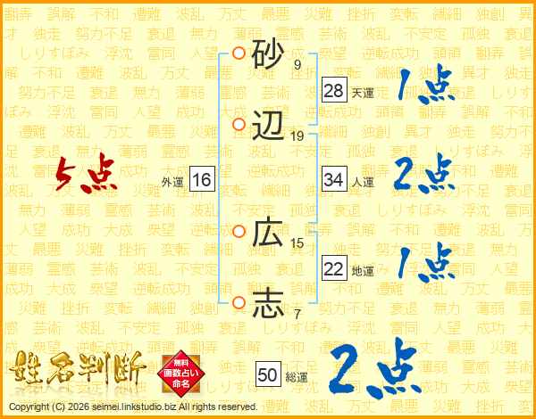 砂(9画)辺(19画) 広(15画)志(7画)
