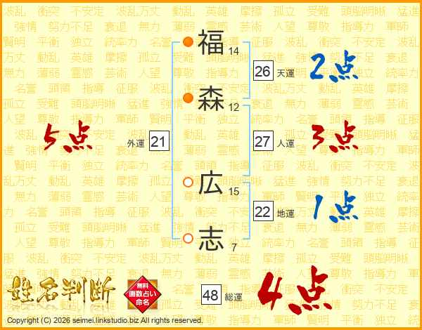 あなたの人生を表す1番重要な運勢です。生涯を通じて影響する総合運となり、主に50歳以降の晩年期に影響を及ぼします。苗字と名前の合計画数。