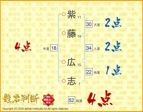 家系が持つ宿命的な運勢を表します。祖先から受け継いだ苗字ですので自分の力が及びません。家柄を象徴します。苗字の合計画数。