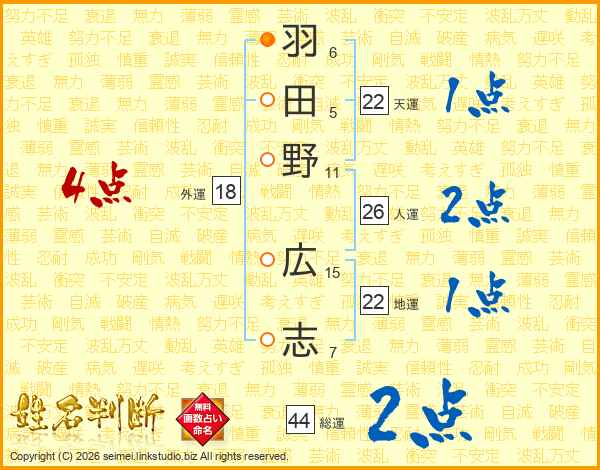 羽(6画)田(5画)野(11画) 広(15画)志(7画)