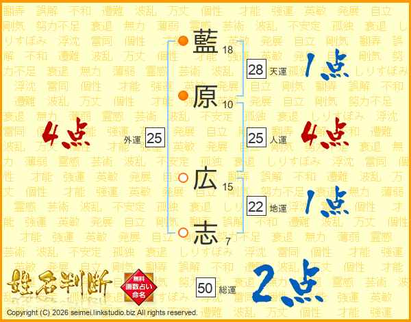 生活面を象徴する運勢です。外部から受ける影響力を表し、結婚運、家庭運や職場、環境への順応性を表します。総運から人運を引いた画数。姓や名が1文字の場合を除く。