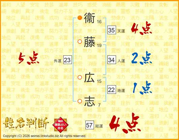 あなたの人生を表す1番重要な運勢です。生涯を通じて影響する総合運となり、主に50歳以降の晩年期に影響を及ぼします。苗字と名前の合計画数。