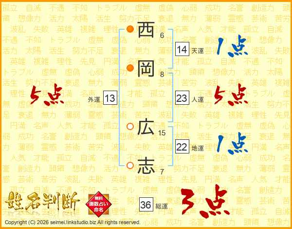 生活面を象徴する運勢です。外部から受ける影響力を表し、結婚運、家庭運や職場、環境への順応性を表します。総運から人運を引いた画数。姓や名が1文字の場合を除く。