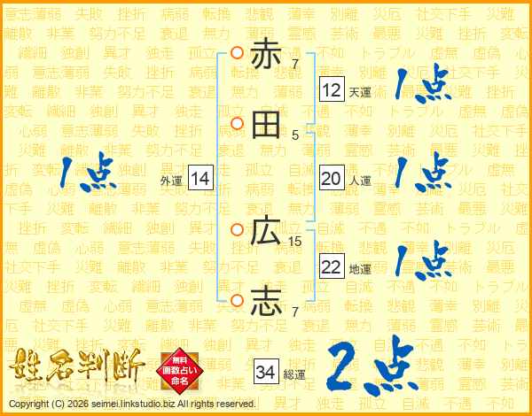 赤田広志さんの総運は34画の2点!