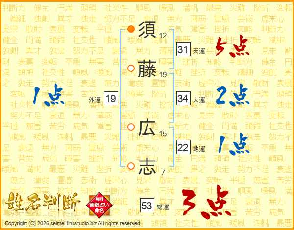 あなたの人生を表す1番重要な運勢です。生涯を通じて影響する総合運となり、主に50歳以降の晩年期に影響を及ぼします。苗字と名前の合計画数。