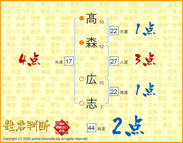 あなたの人生を表す1番重要な運勢です。生涯を通じて影響する総合運となり、主に50歳以降の晩年期に影響を及ぼします。苗字と名前の合計画数。