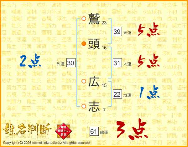 鷲(23画)頭(16画) 広(15画)志(7画)