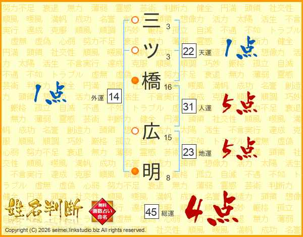 三ツ橋広明さんの総運は45画の4点!