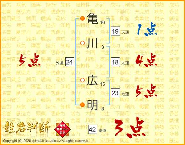 あなたの人生を表す1番重要な運勢です。生涯を通じて影響する総合運となり、主に50歳以降の晩年期に影響を及ぼします。苗字と名前の合計画数。