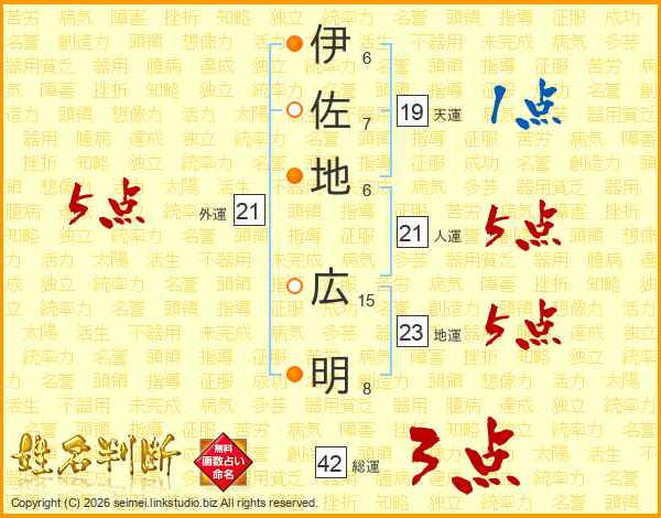伊(6画)佐(7画)地(6画) 広(15画)明(8画)