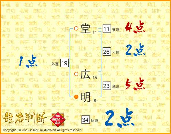 堂(11画) 広(15画)明(8画)