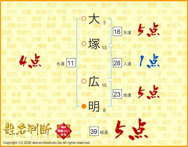 あなたの人生を表す1番重要な運勢です。生涯を通じて影響する総合運となり、主に50歳以降の晩年期に影響を及ぼします。苗字と名前の合計画数。