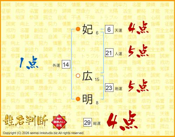 妃広明さんの総運は29画の4点!