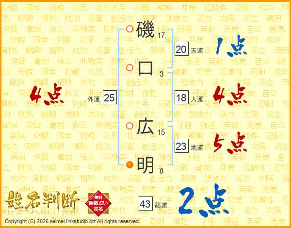 あなたの人生を表す1番重要な運勢です。生涯を通じて影響する総合運となり、主に50歳以降の晩年期に影響を及ぼします。苗字と名前の合計画数。