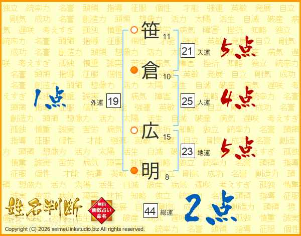 あなたの人生を表す1番重要な運勢です。生涯を通じて影響する総合運となり、主に50歳以降の晩年期に影響を及ぼします。苗字と名前の合計画数。