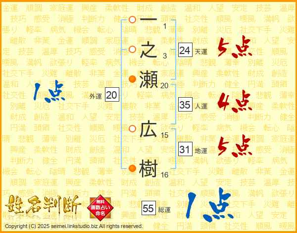 一(1画)之(3画)瀬(20画) 広(15画)樹(16画)