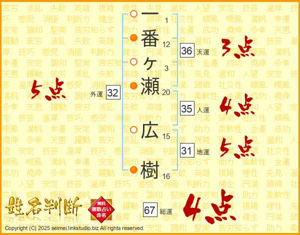一番ヶ瀬広樹さんの総運は67画の4点!