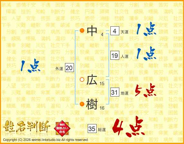 中(4画) 広(15画)樹(16画)