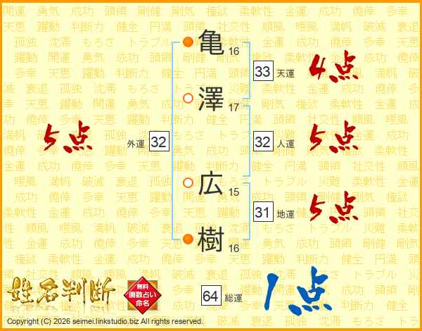 亀(16画)澤(17画) 広(15画)樹(16画)