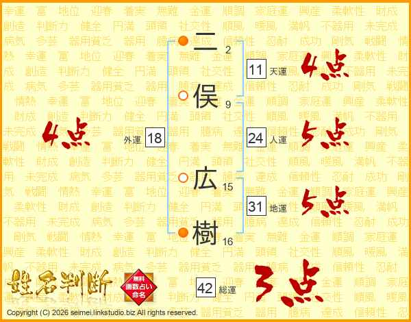 生活面を象徴する運勢です。外部から受ける影響力を表し、結婚運、家庭運や職場、環境への順応性を表します。総運から人運を引いた画数。姓や名が1文字の場合を除く。