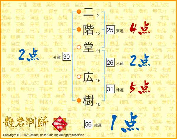 二(2画)階(12画)堂(11画) 広(15画)樹(16画)