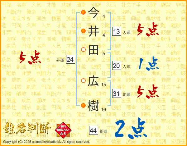 今(4画)井(4画)田(5画) 広(15画)樹(16画)