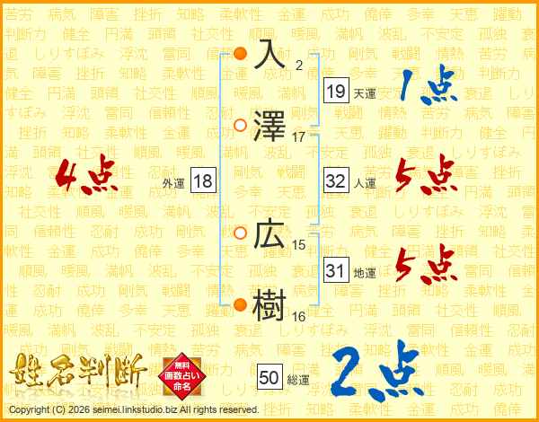 入(2画)澤(17画) 広(15画)樹(16画)