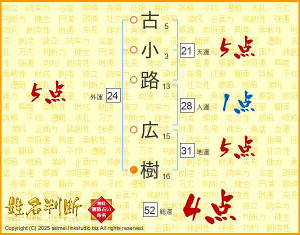 古(5画)小(3画)路(13画) 広(15画)樹(16画)