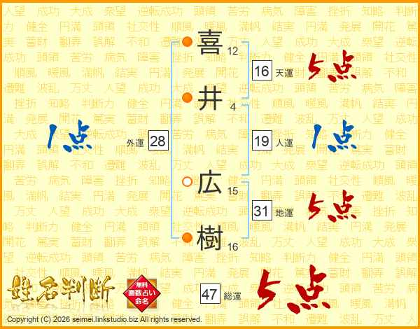 喜(12画)井(4画) 広(15画)樹(16画)