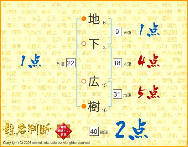 生活面を象徴する運勢です。外部から受ける影響力を表し、結婚運、家庭運や職場、環境への順応性を表します。総運から人運を引いた画数。姓や名が1文字の場合を除く。