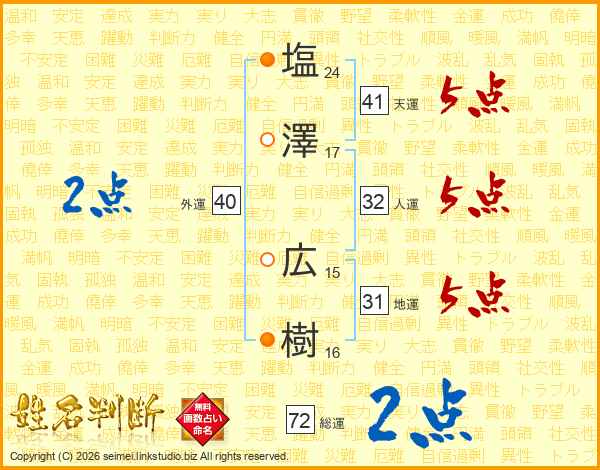塩(24画)澤(17画) 広(15画)樹(16画)