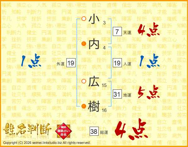 生活面を象徴する運勢です。外部から受ける影響力を表し、結婚運、家庭運や職場、環境への順応性を表します。総運から人運を引いた画数。姓や名が1文字の場合を除く。