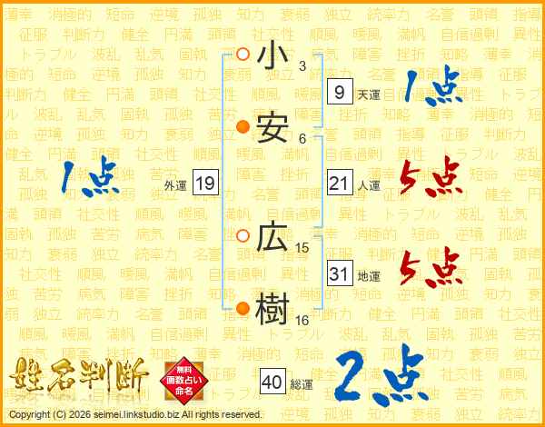 生活面を象徴する運勢です。外部から受ける影響力を表し、結婚運、家庭運や職場、環境への順応性を表します。総運から人運を引いた画数。姓や名が1文字の場合を除く。