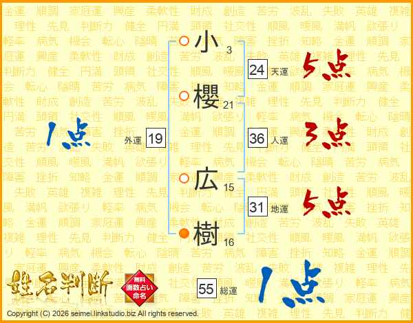 小(3画)櫻(21画) 広(15画)樹(16画)