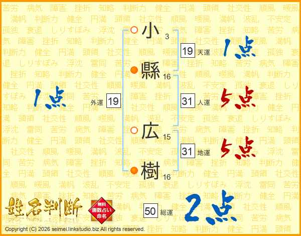 生活面を象徴する運勢です。外部から受ける影響力を表し、結婚運、家庭運や職場、環境への順応性を表します。総運から人運を引いた画数。姓や名が1文字の場合を除く。