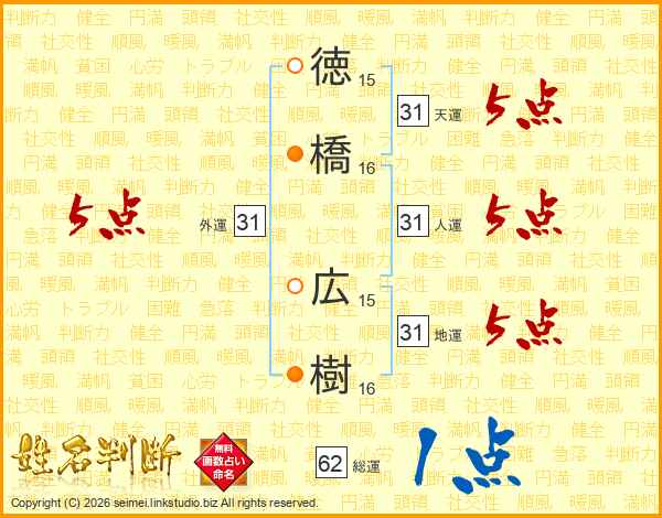 徳(15画)橋(16画) 広(15画)樹(16画)
