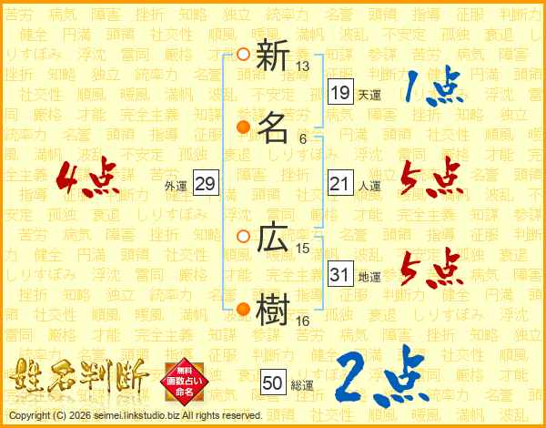 新(13画)名(6画) 広(15画)樹(16画)