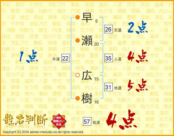 早瀬広樹さんの総運は57画の4点!