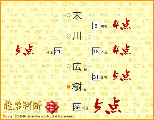 あなたの人生を表す1番重要な運勢です。生涯を通じて影響する総合運となり、主に50歳以降の晩年期に影響を及ぼします。苗字と名前の合計画数。