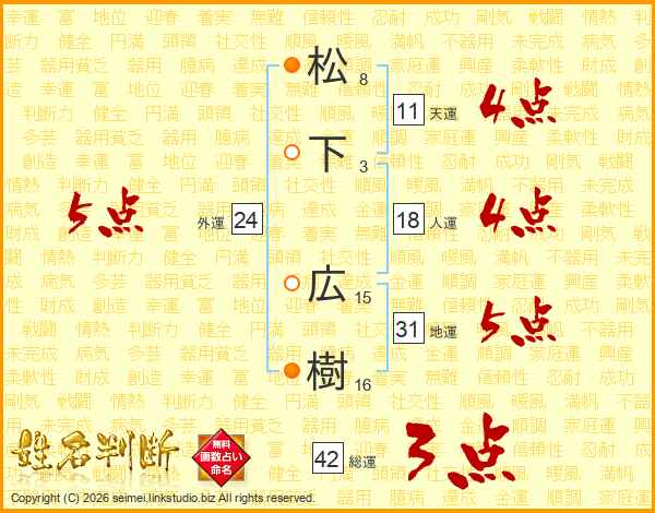 生活面を象徴する運勢です。外部から受ける影響力を表し、結婚運、家庭運や職場、環境への順応性を表します。総運から人運を引いた画数。姓や名が1文字の場合を除く。