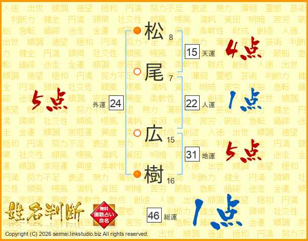 生活面を象徴する運勢です。外部から受ける影響力を表し、結婚運、家庭運や職場、環境への順応性を表します。総運から人運を引いた画数。姓や名が1文字の場合を除く。