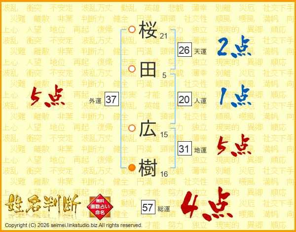 桜(21画)田(5画) 広(15画)樹(16画)