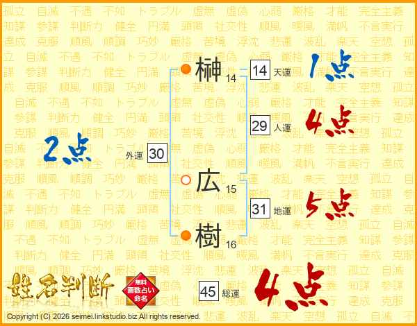 生活面を象徴する運勢です。外部から受ける影響力を表し、結婚運、家庭運や職場、環境への順応性を表します。総運から人運を引いた画数。姓や名が1文字の場合を除く。