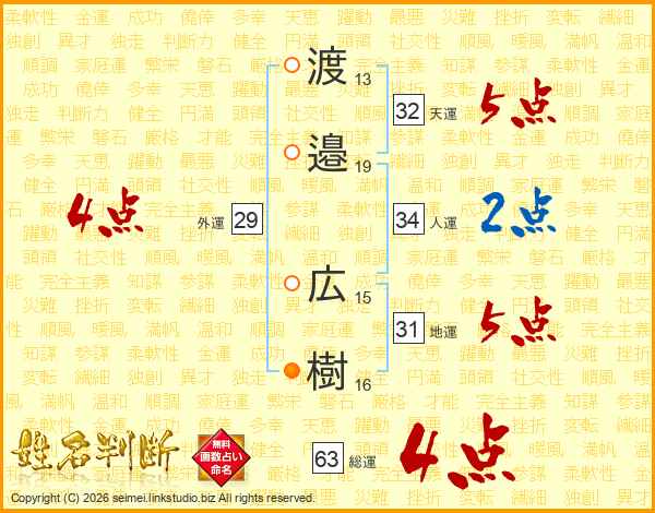 渡(13画)邉(19画) 広(15画)樹(16画)